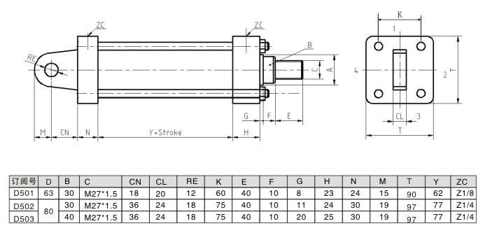 以下為銷孔安裝的低壓拉桿液壓缸的尺寸圖及參數。